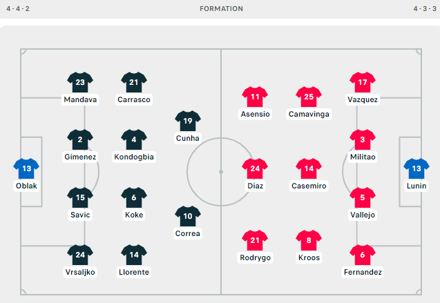 AEGoal cập nhật chính xác ĐỘI HÌNH RA SÂN trận Atletico Madrid vs Real Madrid diễn ra lúc 02h00 ngày 09/05 trong khuôn khổ giải VĐQG Tây Ban Nha.