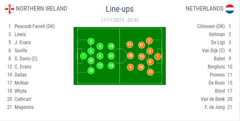 AEGoal.net cập nhật chính xác ĐỘI HÌNH RA SÂN trận Bắc Ireland vs Hà Lan diễn ra lúc 02h45 ngày 17/11 trong khuôn khổ Bảng C - Vòng loại EURO 2020.
