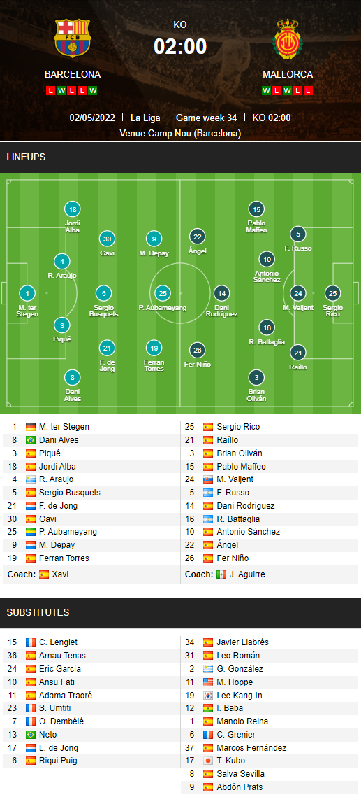 AEGoal cập nhật chính xác ĐỘI HÌNH RA SÂN trận Barcelona vs Mallorca diễn ra lúc 02h00 ngày 02/5 trong khuôn khổ giải VĐQG Tây Ban Nha.