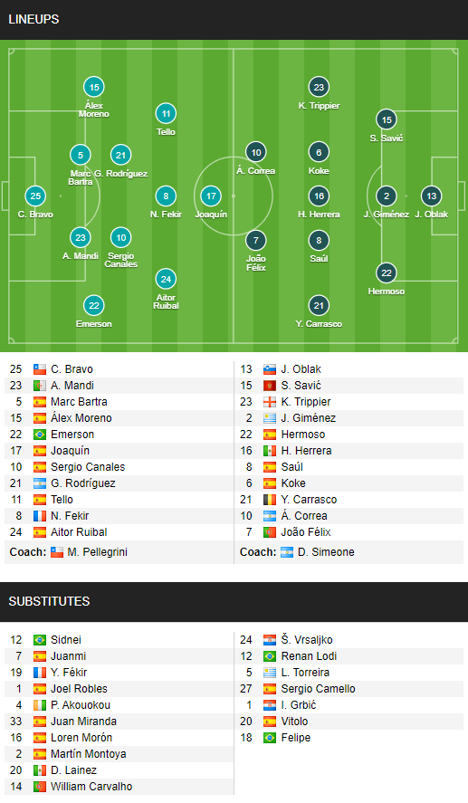 ĐỘI HÌNH RA SÂN trận Betis vs Atletico Madrid, 02h00 ngày 12/04: VĐQG Tây Ban Nha