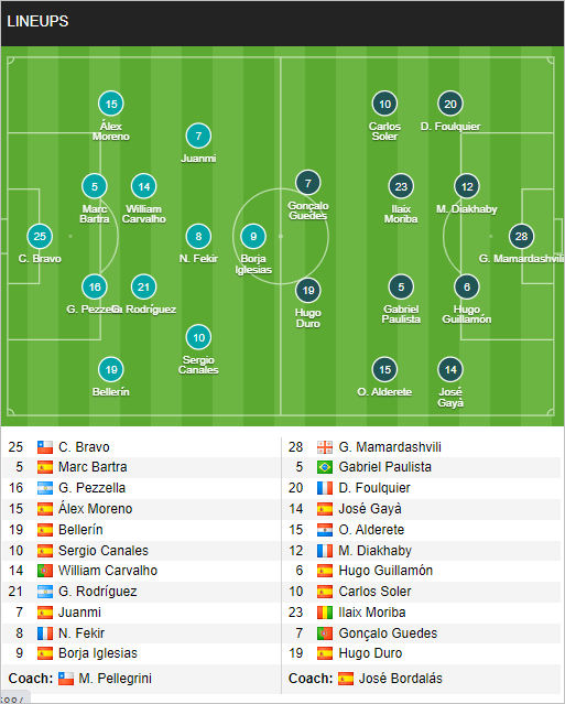 Betis: Silva; Bellerin, Pezzella, Bartra, Moreno; Rodriguez, Carvalho; Canales, Fekir, Juanmi; Iglesias.