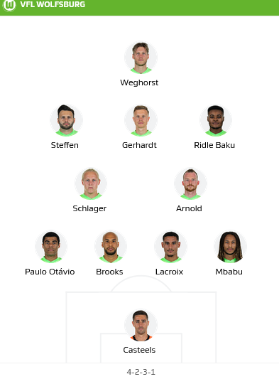 Wolfsburg (4-2-3-1): Koen Casteels; Kevin Mbabu, Maxence Lacroix, John Brooks, Otavio; Xaver Schlager, Maximilian Arnold; Ridle Baku, Yannick Gerhardt, Josip Brekalo; Wout Weghorst.