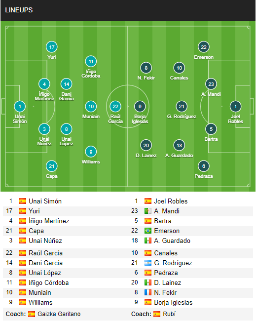 AEGoal.net cập nhật chính xác ĐỘI HÌNH RA SÂN trận Bilbao vs Betis diễn ra lúc 22h00 ngày 20/6 trong khuôn khổ Vòng 30 - VĐQG Tây Ban Nha.