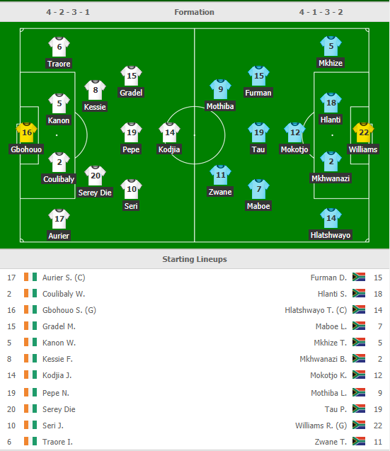 AEGoal.net cập nhật chính xác ĐỘI HÌNH RA SÂN trận Bờ Biển Ngà vs Nam Phi diễn ra lúc 21h30 ngày 24/06 trong khuôn khổ vòng bảng CAN cup 2019