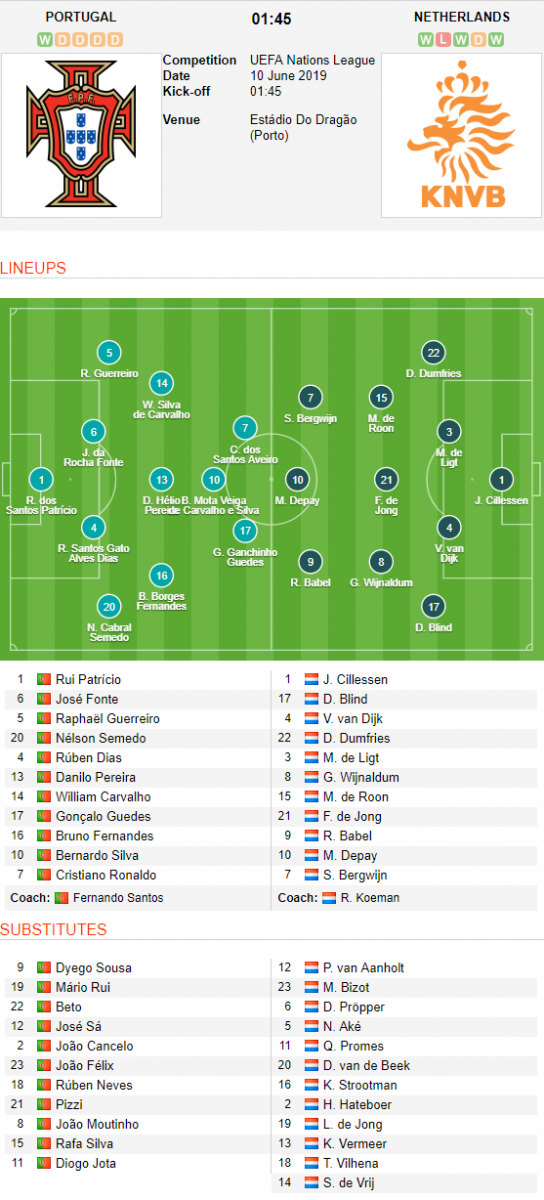 AEGoal.net cập nhật chính xác ĐỘI HÌNH RA SÂN trận Bồ Đào Nha vs Hà Lan diễn ra lúc 01h45 ngày 10/6 trong khuôn khổ trận chung kết UEFA Nations League