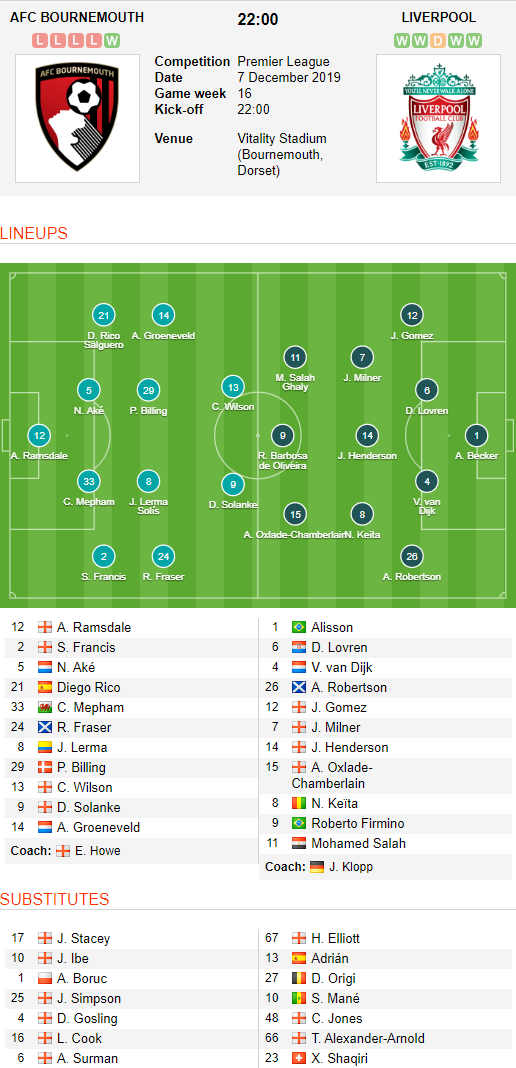 AEGoal.net cập nhật chính xác ĐỘI HÌNH RA SÂN trận Bournemouth vs Liverpool diễn ra lúc 22h00 ngày 07/12 trong khuôn khổ giải Ngoại hạng Anh.