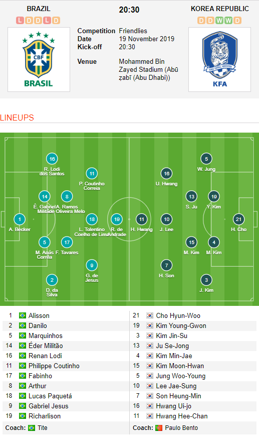 AEGoal.net cập nhật chính xác ĐỘI HÌNH RA SÂN trận Brazil vs Hàn Quốc diễn ra lúc 20h30 ngày 19/11 trong khuôn khổ Giao hữu Quốc tế.