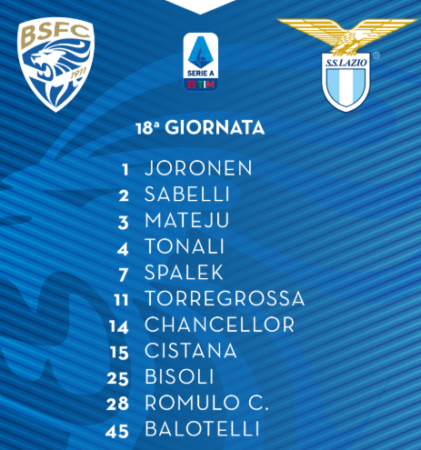 AEGoal.net cập nhật chính xác ĐỘI HÌNH RA SÂN trận Brescia vs Lazio diễn ra lúc 18h30 ngày 05/01 trong khuôn khổ vòng 18 giải VĐQG Italia.