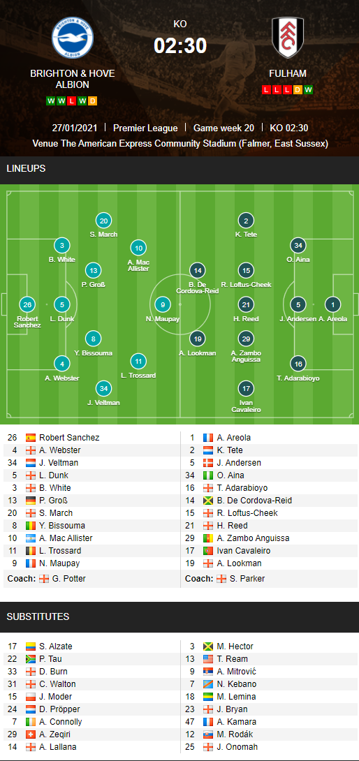 AEGoal cập nhật chính xác ĐỘI HÌNH RA SÂN trận Brighton vs Fulham diễn ra lúc 02h30 ngày 28/01 trong khuôn khổ vòng 20 - giải Ngoại hạng Anh.