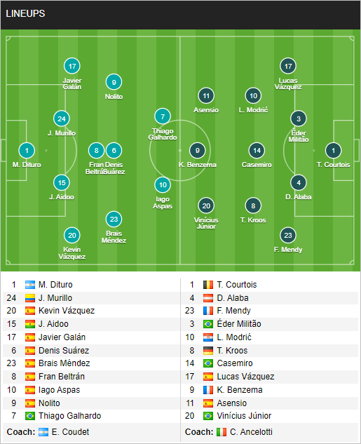 AEGoal cập nhật chính xác ĐỘI HÌNH RA SÂN trận Celta Vigo vs Real Madrid diễn ra lúc 23h30 ngày 2/4 trong khuôn khổ giải VĐQG Tây Ban Nha.