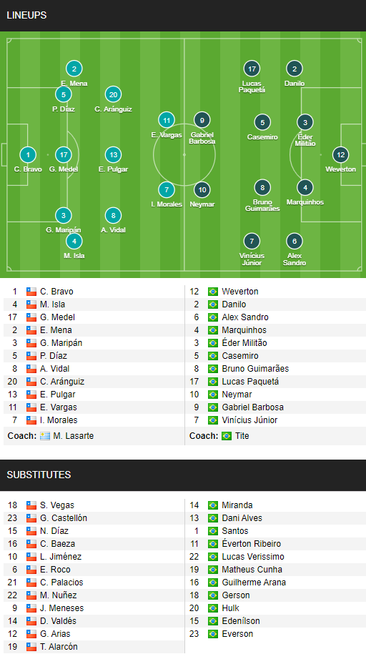 - Chile (4-3-1-2): Bravo - Isla, Medel, Maripan, Mena - Vidal, Aranguiz, Pulgar - Jiminez - Meneses, Vargas