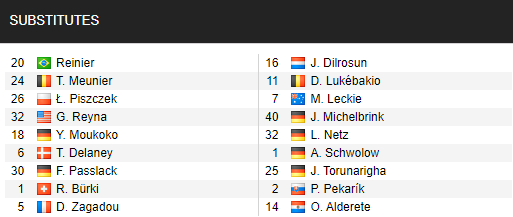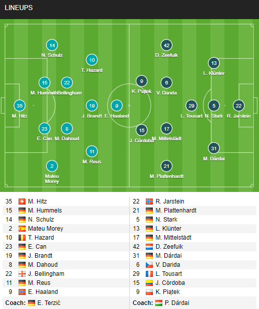 - Dortmund (4-3-3): Hitz - Morey, Can, Hummels, Schulz - Bellingham, Delaney, Dahoud - Reus (c), Haaland, Brandt