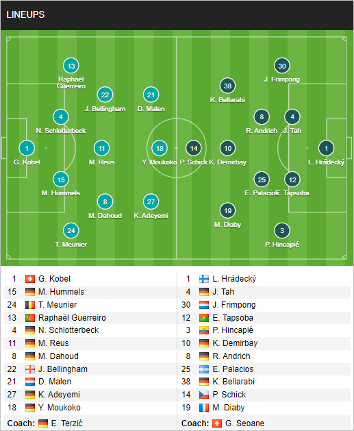 - Dortmund: Niklas Sule và Felix Passlack không thể góp mặt vì chấn thương; trong khi Sebastien Haller cũng vắng vô thời hạn để điều trị ung thư.
