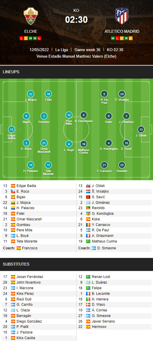 ĐỘI HÌNH RA SÂN trận Elche vs Atletico Madrid, 02h30 ngày 12/05: VĐQG Tây Ban Nha