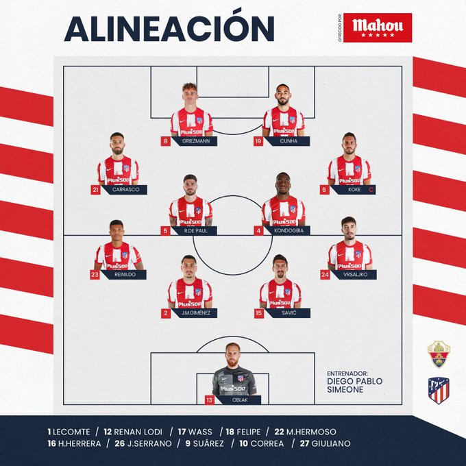 Atletico Madrid: Oblak; Vrsaljko, Savic, Gimenez, Lodi; Llorente, Koke, De Paul, Carrasco; Correa, Griezmann