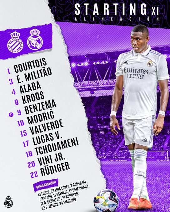 Real Madrid: Courtois, Mendy, Alaba, Militao, Carvajal, Camaviga, Tchounameni, Luka Modric, Vinicius, Benzema, Valverde.