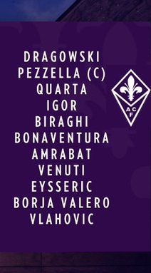 Fiorentina (3-5-2): Dragowski; Quarta, Pezzella, Igor; Venuti, Bonaventura, Amrabat, Borja Valero, Biraghi; Eysseric, Vlahovic.