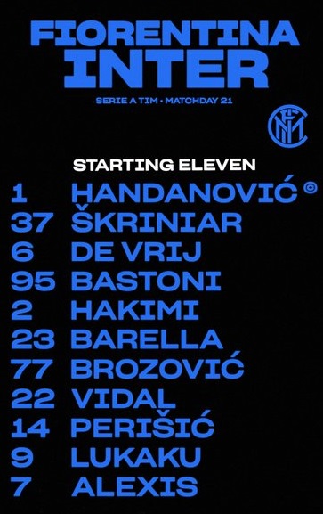 Inter (3-5-2): Handanovic; Skriniar, De Vrij, Bastoni; Hakimi, Barella, Brozovic, Vidal, Perisic; Sanchez, Lukaku.