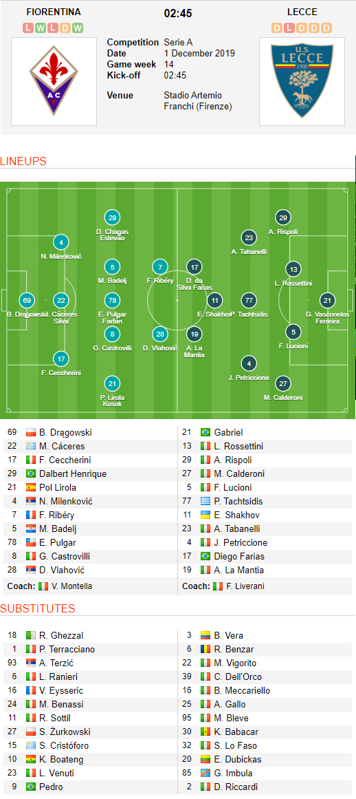 AEGoal.net cập nhật chính xác ĐỘI HÌNH RA SÂN trận Fiorentina vs Lecce diễn ra lúc 02h45 ngày 01/12 trong khuôn khổ Vòng 14 - VĐQG Italia.