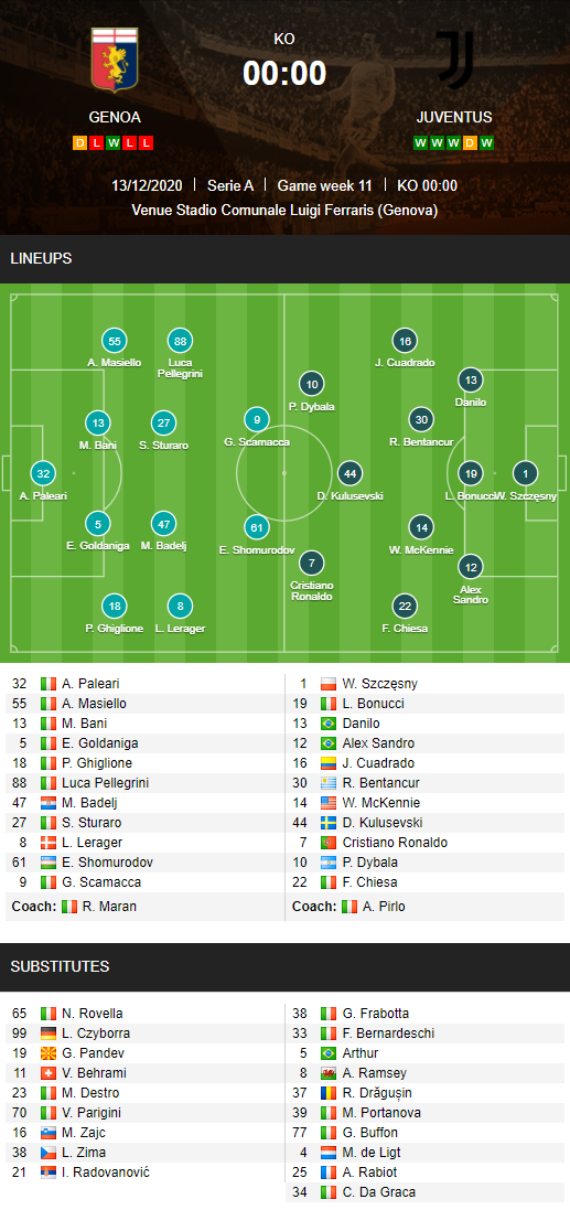 AEGoal cập nhật chính xác ĐỘI HÌNH RA SÂN trận Genoa vs Juventus diễn ra lúc 00h00 ngày 14/12 trong khuôn khổ giải VĐQG Italia