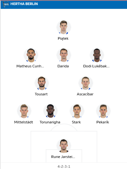 Hertha Berlin: Jarstein - Pekarik, Stark (c), Torunarigha, Mittelstädt - Ascacibar, Tousart - Lukebakio, Darida, Cunha - Piatek
