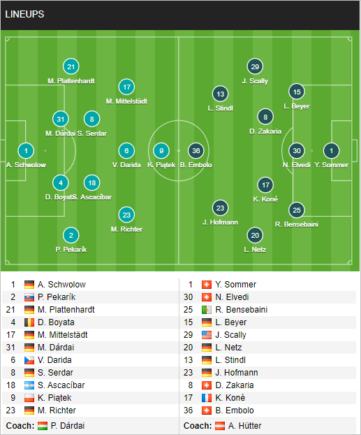 Monchengladbach: Stefan Lainer, Mamadou Doucouré, Christoph Kramer chấn thương. Marcus Thuram, Ramy Bensebaini, Denis Zakaria chưa chắc ra sân.