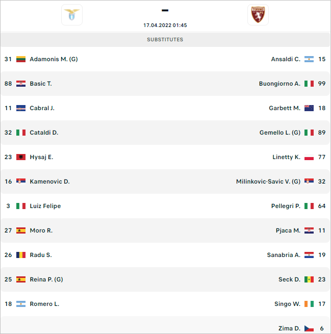 * Danh sách dự bị trận Lazio vs Torino, 1h45 ngày 17/4: VĐQG Italia