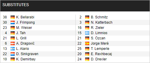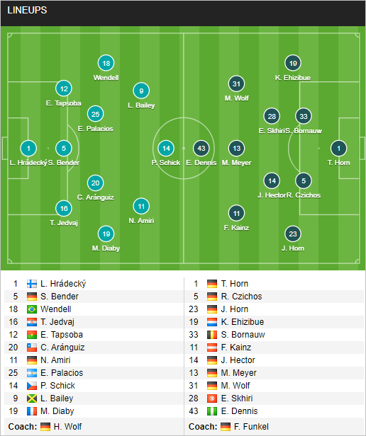 Leverkusen: Hradecky; Jedvaj, Bender, Tapsoba; Diaby, Aranguiz, Demirbay, Wendell; Wirtz; Schick, Alario