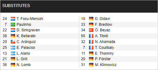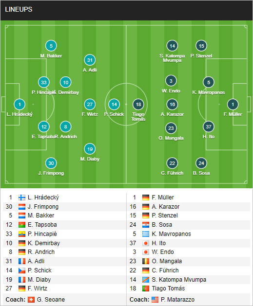 Leverkusen: Hradecky; Frimpong, Tah, Hincapie, Bakker; Andrich, Demirbay; Bellarabi, Wirtz, Diaby; Schick