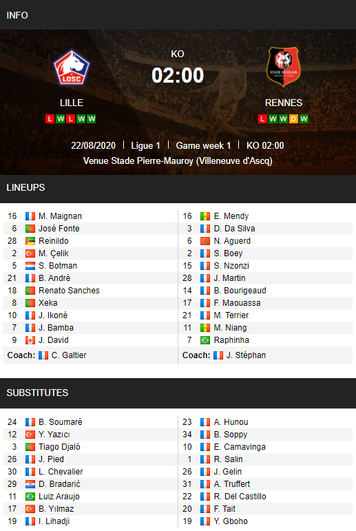 AEGoal.net cập nhật chính xác ĐỘI HÌNH RA SÂN trận Lilles vs Rennes diễn ra lúc 02h00 ngày 23/08 trong khuôn khổ vòng 1 giải VĐQG Pháp.