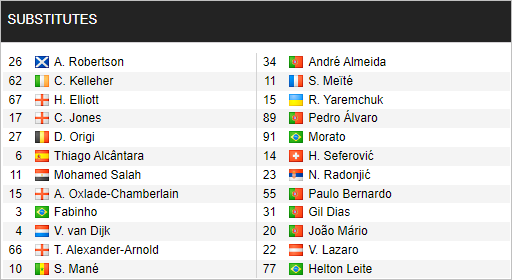 +Takumi Minamino , Harvey Elliott , Divock Origi và Alex Oxlade-Chamberlain đều không có cơ hội đá chính trận này.