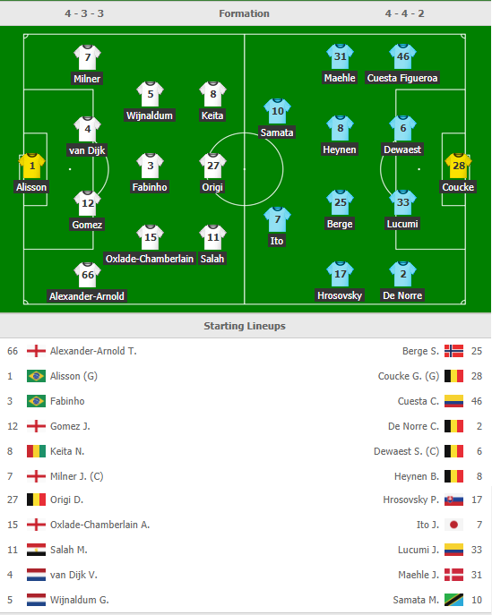 Liverpool (4-3-3): Alisson; Alexander-Arnold, Gomez, Van Dijk, Robertson; Milner, Fabinho, Wijnaldum; Oxlade-Chamberlain, Firmino, Origi