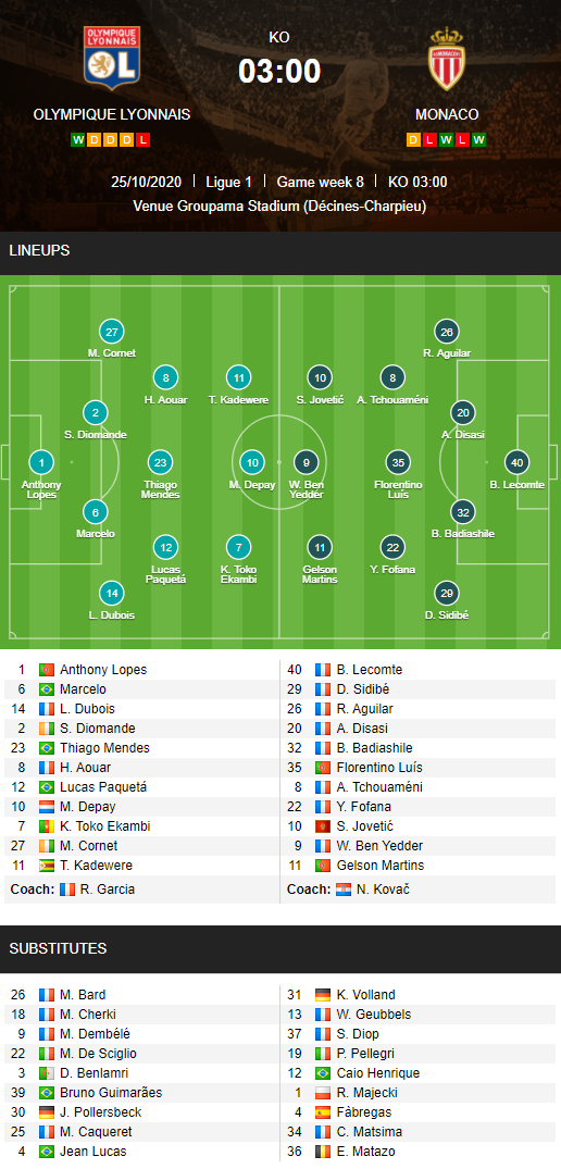 AEGoal.net cập nhật chính xác ĐỘI HÌNH RA SÂN trận Lyon vs Monaco diễn ra lúc 03h00 ngày 26/10 trong khuôn khổ giải VĐQG Pháp.