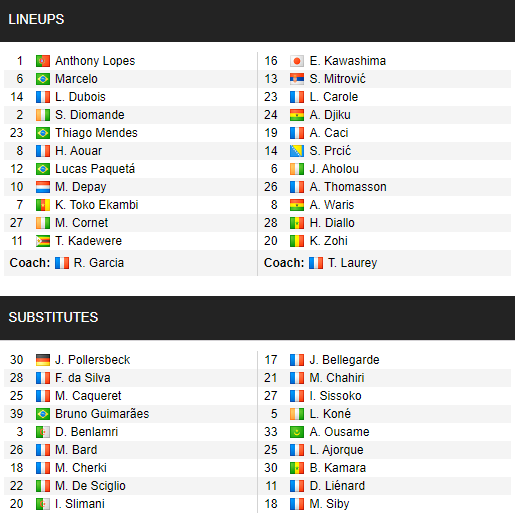 Lyon: Lopes; Dubois, Diomande, Marcelo, Cornet; Guimaraes, Aouar, Paqueta; Kadewere, Depay, Toko Ekambi.