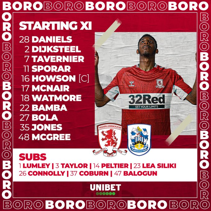 Middlesbrough (3-5-2): Luke Daniels; Anfernee Dijksteel, Sol Bamba, Paddy McNair; Marc Bola, Riley McGree, Jonathan Howson, Marcus Tavernier, Isaiah Jones; Aaron Connolly, Folarin Balogun