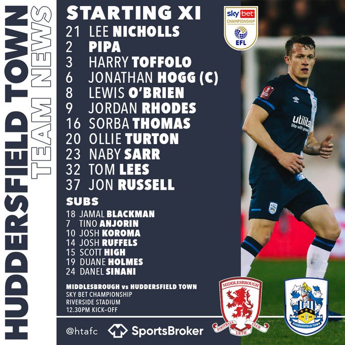 Huddersfield (4-3-3): Lee Nicholls; Oliver Turton, Levi Colwill, Tom Lees, Harry Toffolo; Lewis O'Brien, Jonathan Russell, Jonathan Hogg; Sorba Thomas, Danel Sinani, Josh Koroma