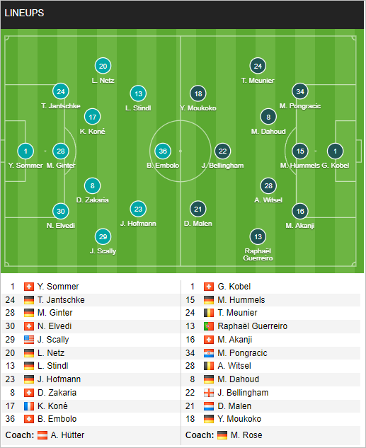 Dortmund: Reyna, Tigges, Emre Can, Schulz, Coulibaly, Schmelzer, Zagadou chấn thương