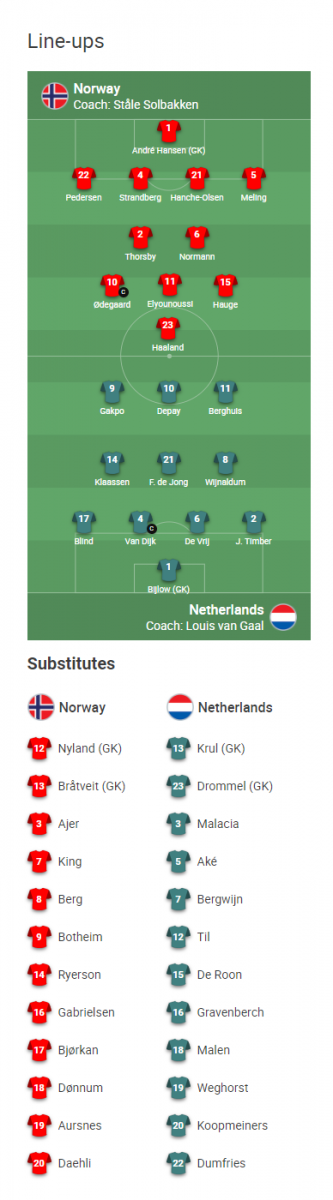 AEGoal cập nhật chính xác ĐỘI HÌNH RA SÂN trận Na Uy vs Hà Lan diễn ra lúc 01h45 ngày 2/9 trong khuôn khổ Vòng loại WC 2022 khu vực châu Âu.