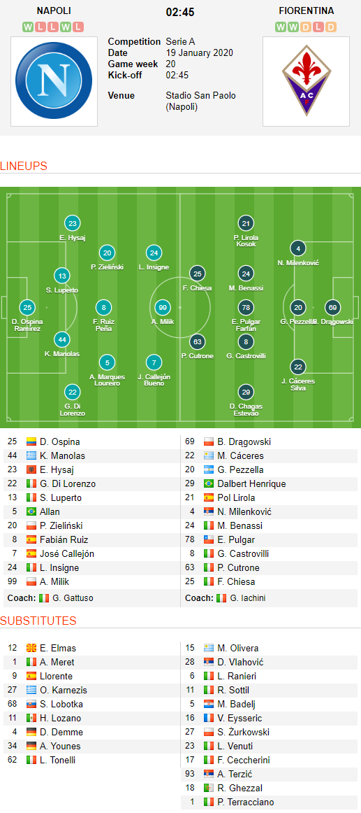ĐỘI HÌNH RA SÂN trận Napoli vs Fiorentina, 02h45 ngày 19/1: VĐQG Italia