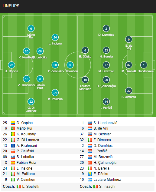 AEGoal cập nhật chính xác ĐỘI HÌNH RA SÂN trận Napoli vs Inter Milan diễn ra lúc 00h00 ngày 13/02 trong khuôn khổ VĐQG Italia.