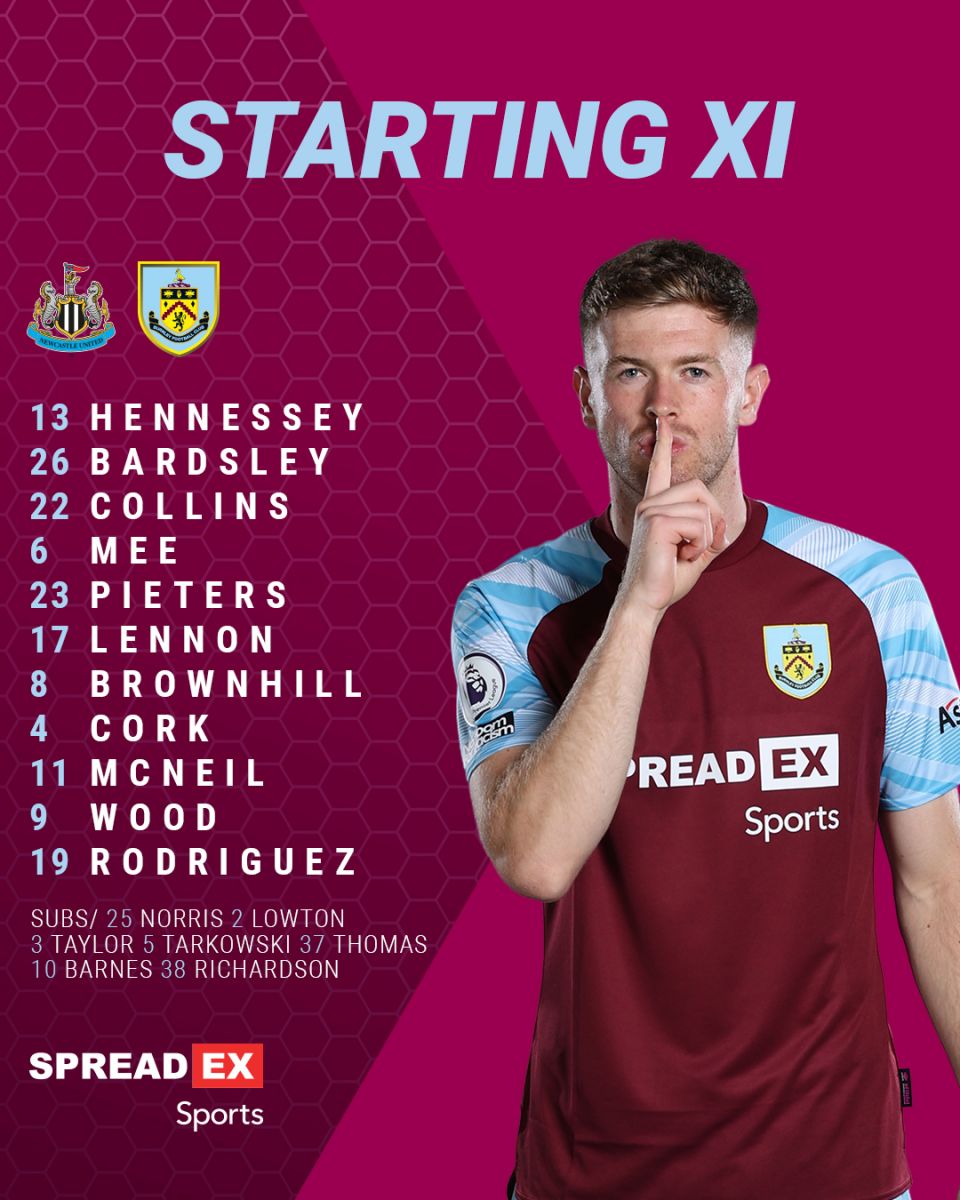 Burnley (4-4-2): Nick Pope; Charlie Taylor, Ben Mee, James Tarkowski, Matthew Lowton; Dwight McNeil, Jack Cork, Ashley Westwood, Johann Gudmoundsson; Jay Rodriguez, Chris Wood