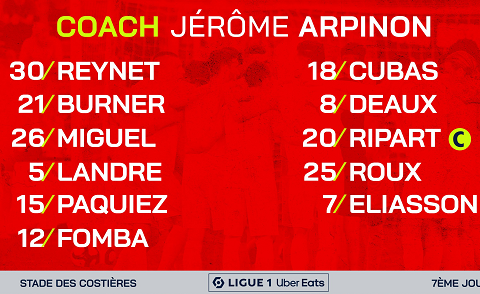 - Nimes (4-2-3-1): Reynet; Meling, Briancon, Pablo Martinez, Burner; Cubas, Lucas Deaux; Lamine Fomba, Benrahou, Ripart; Denkey.