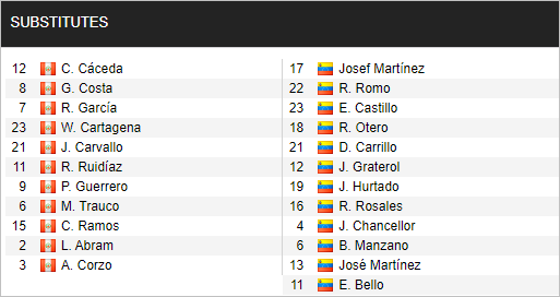 Peru: Gallese; Lopez, Callens, Santamaria, Advincula; Tapia, Yotun, Cueva; Carrillo, Flores, Lapadula