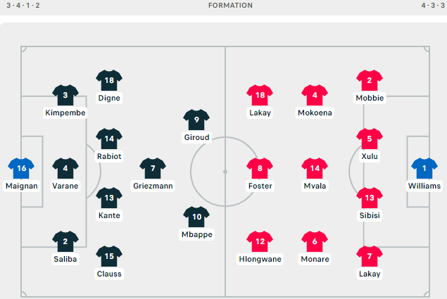 Pháp (4-2-3-1): Mike Maignan, Jonathan Clauss, William Saliba, Presnel Kimpembe, Lucas Hernandez, Aurelien Tchouameni, Matteo Guendouzi, Moussa Diaby, Christopher Nkunku, Kylian Mbappe, Olivier Giroud.