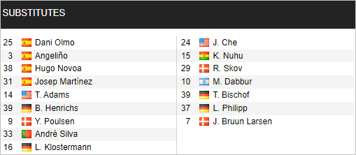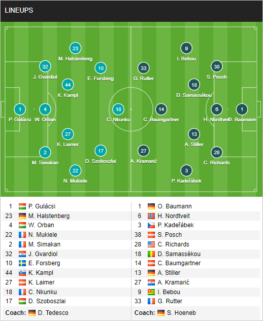 - RB Leipzig: Yussuf Poulsen và Amadou Haidara vắng mặt vì chấn thương; trong khi Benjamin Henrichs và Lukas Klostermann vẫn chưa chắc chắn ra sân.