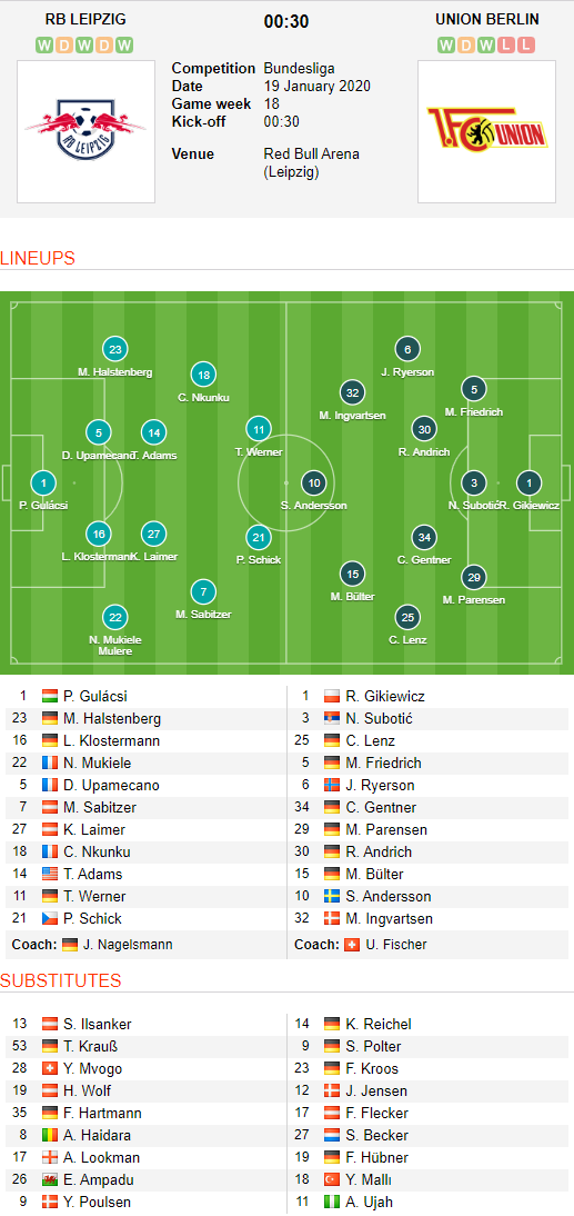 AEGoal.net cập nhật chính xác ĐỘI HÌNH RA SÂN trận RB Leipzig vs Union Berlin diễn ra lúc 00h30 ngày 19/1 trong khuôn khổ giải VĐQG Đức.