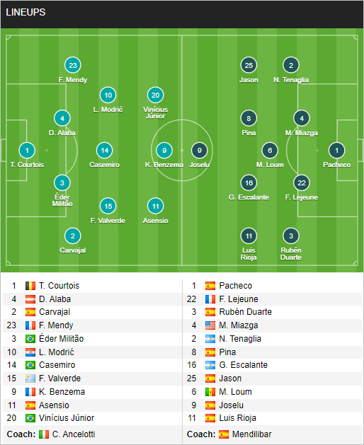 Real Madrid: Courtois; Carvajal, Militao, Alaba, Mendy; Valverde, Casemiro, Kroos; Rodrygo, Benzema, Vinicius