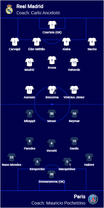 AEGoal cập nhật chính xác ĐỘI HÌNH RA SÂN trận Real Madrid vs PSG diễn ra lúc 03h00 ngày 10/03 trong khuôn khổ UEFA Champions League.