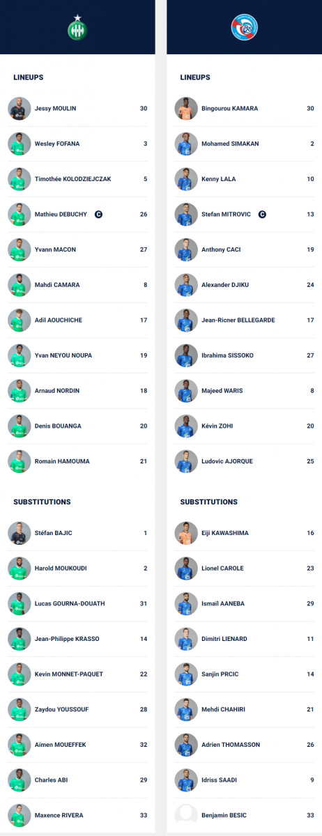 Strasbourg: Kawashima; Koné, Djiku, Carole, Lala, Simakan, Sissoko, Chahiri, Thomasson, Bellegarde, Ajorque.