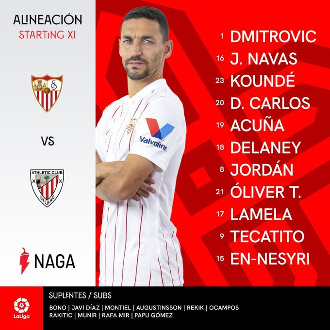 Sevilla: Bono, Montiel, Kounde, Carlos, Acuna, Rakitic, Gudeji, Delaney, Ocampos, En Nesyri, Gomez.